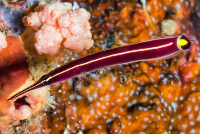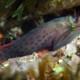 The shore clingfish measures between 4 and 6.5 cm. This fish is tricolore with a predominantly rouge, marron and beige body. The also has bleu ponctuations.