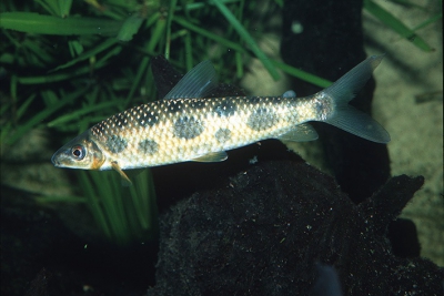 Leporinus friderici measures around 30 cm. The females are more imposing and some specimens can reach 40 cm. This fish is unicolore with a predominantly argent body. The also has noir ponctuations.