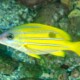 The bluestripe snapper measures between 25 and 40 cm. This fish is bicolore with a predominantly jaune and argent body. The also has bleu horizontal stripes.