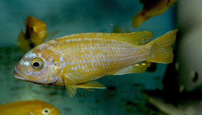 Maylandia sp. Msobo Magunga measures between 10 and 11 cm. This fish is unicolore with a predominantly jaune and bleu body.