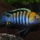 Cynotilapia zebroides measures between 10 and 12 cm. This fish is tricolore with a predominantly jaune, bleu and noir body.