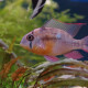 Mikrogeophagus altispinosus measures between 5 and 6 cm. This fish is multicolore with a predominantly orange, noir and rose body.