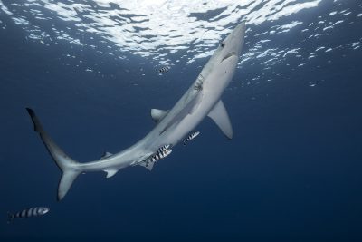 Negaprion brevirostris measures between 240 and 340 cm. This fish is bicolore with a predominantly blanc and gris body.