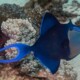 The red-toothed triggerfish measures between 30 and 50 cm. This fish is bicolore with a predominantly bleu and vert body.