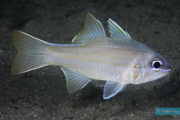 The spotted-gill cardinalfish measures between 8 and 10 cm. This fish is unicolore with a predominantly jaune and beige body. The also has noir horizontal stripes.