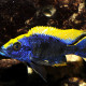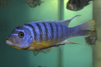 Otopharynx lithobates measures around 10 cm. The dominant males can however reach 16 cm. This fish is bicolore with a predominantly jaune, bleu and argent body.