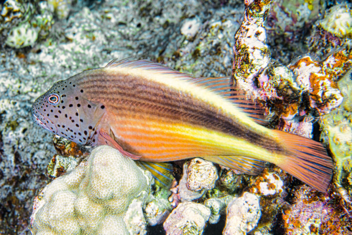 The blackside hawkfish measures between 18 and 22 cm. This fish is multicolore with a predominantly rouge, jaune, noir and blanc body. The also has rouge ponctuations.