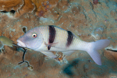 The whitesaddle goatfish measures between 25 and 38 cm. This fish is multicolore with a predominantly rouge, bleu, marron and blanc body. The also has blanc horizontal stripes.