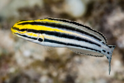Pomachromis richardsoni measures between 4 and 6 cm. This fish is tricolore with a predominantly jaune, bleu and noir body.