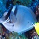 Prionurus laticlavius measures between 25 and 40 cm. This fish is tricolore with a predominantly jaune, noir and gris body. The also has rayure verticale.