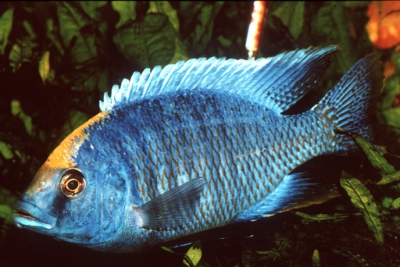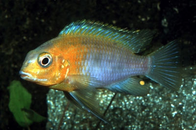 The Spindle hap measures between 13 and 15 cm. This fish is bicolore with a predominantly bleu and orange body.
