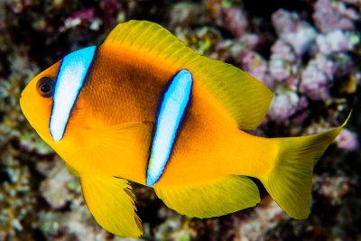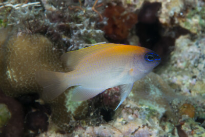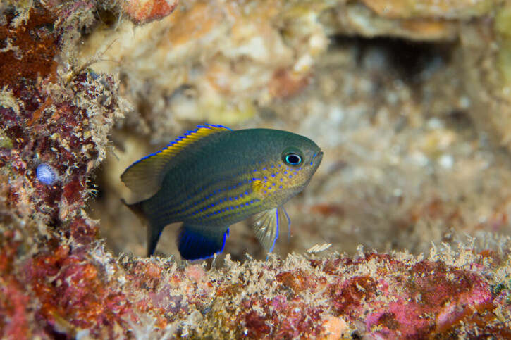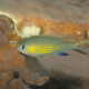 Pycnochromis vanderbilti measures between 4 and 6 cm. This fish is tricolore with a predominantly jaune, bleu and noir body. The also has bleu horizontal stripes.
