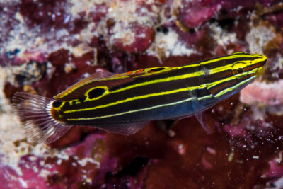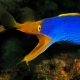 The ribbon moray is bicolored with a predominantly yellow and blue body. It is always born male. As they grow, individuals will change sex to become female, a phenomenon known as protandrous sequential hermaphroditism.