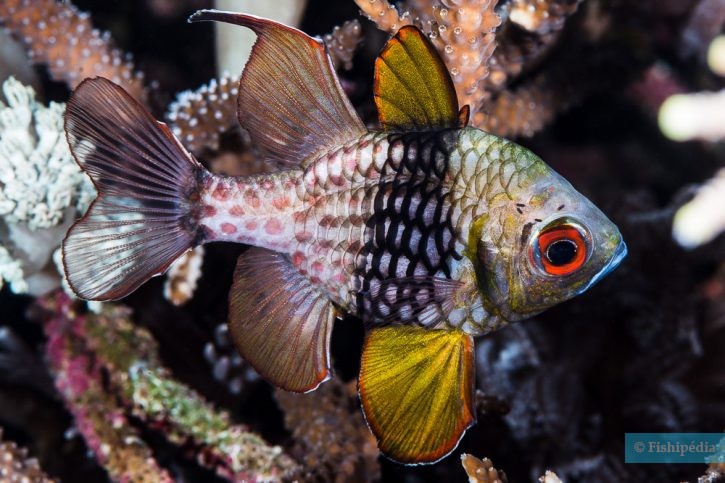The pajama cardinalfish measures between 8 and 9 cm. This fish is multicolore with a predominantly jaune, vert, marron and beige body. The also has noir vertical stripes.