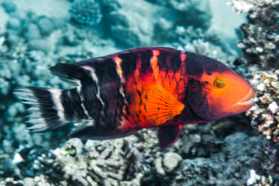 The rouquié measures between 6 and 10 cm. This fish is bicolore with a predominantly marron, blanc and beige body. The also has marron and blanc horizontal stripes.