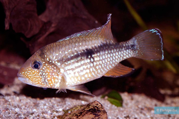The bujurquina is a fish that lives in pairs and naturally resides near the bottom. It is a species with a rather calm temperament. This species tends to easily get stressed: this discomfort is marked by the appearance of dark bars across its body.