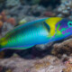 Thalassoma genivittatum measures around 15 cm. The dominant males can however reach 20 cm. This fish is multicolore with a predominantly jaune, bleu, vert, beige and violet body.