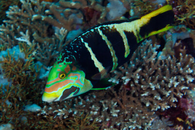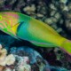The yellow-brown wrasse measures around 25 cm. The dominant males can however reach 30 cm. This fish is multicolore with a predominantly jaune, bleu and vert body. The also has rouge diagonal stripes.
