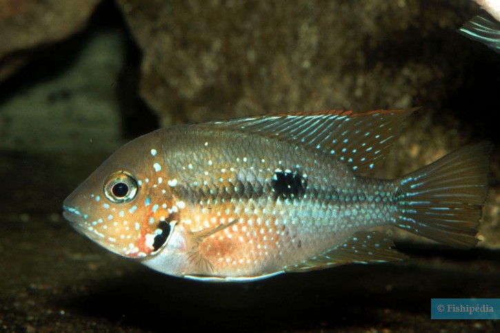 The spotcheek cichlid is a fish living as a couple naturally found near the bottom. This species is omnivorous with carnivorous tendency . Naturally, it tends to dig into the sand and transform its environment.