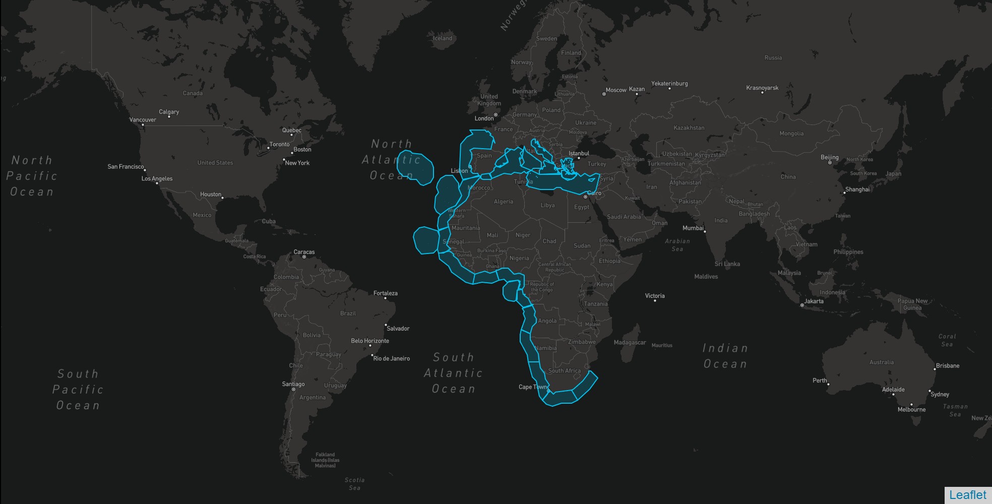 The distribution range of Torpedo marmorata extends from the east of the Atlantic Ocean, from the British Isles to South Africa, and is also found in the Mediterranean basin.
