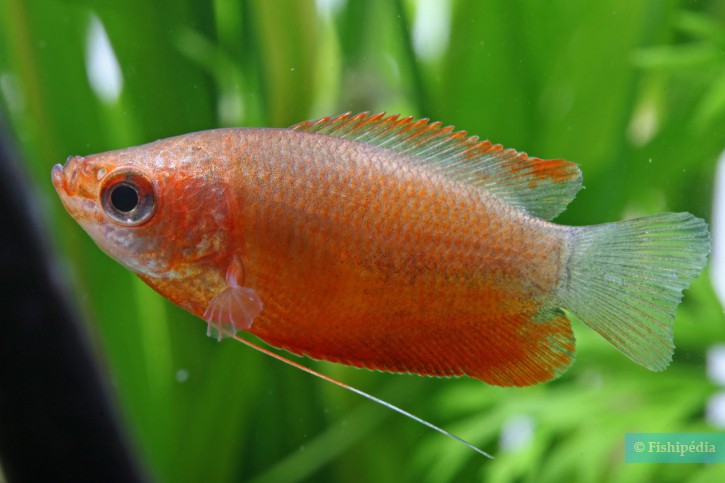 Trichogaster labiosa is a fish living as a couple or in a group naturally found at mid-depth. This species is carnivorous .
