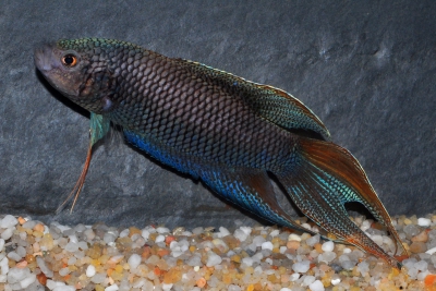 Trichogaster labiosa measures between 8 and 9 cm. This fish is unicolore with a predominantly bleu, orange and marron body.
