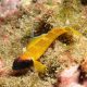 The black-faced blenny is two-colored with a black head and yellow body. Upon closer observation, brownish vertical stripes can be seen throughout the body. The head is covered with small shiny spots like other Tripterygion species.