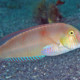 Older females are pink to reddish, with a yellowish head. Light blue vertical stripes are visible on the body, anal and caudal fins, and the white spot is still present.