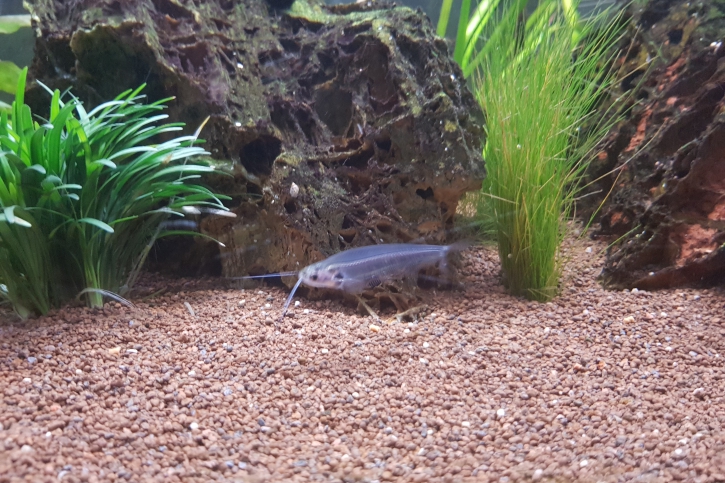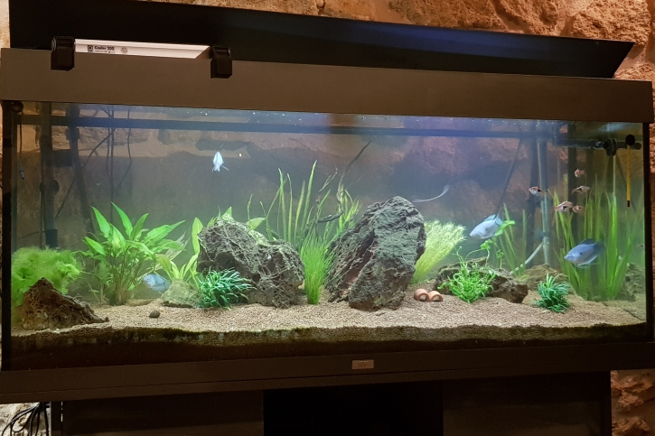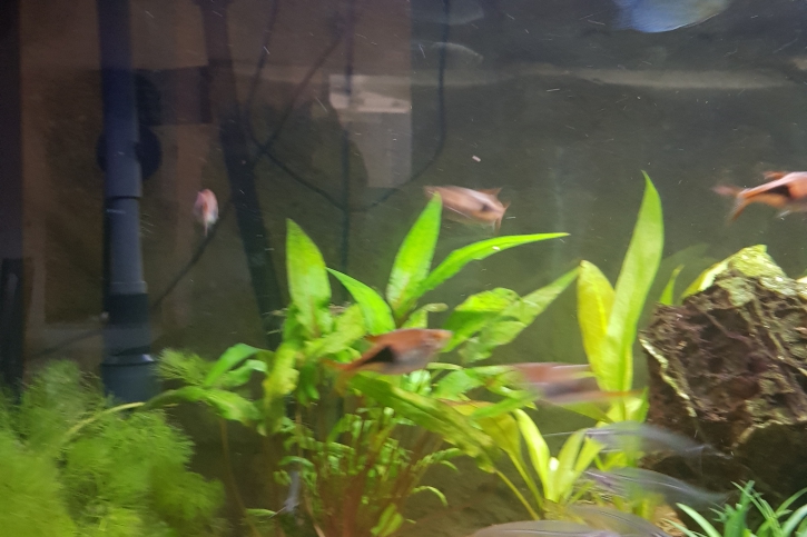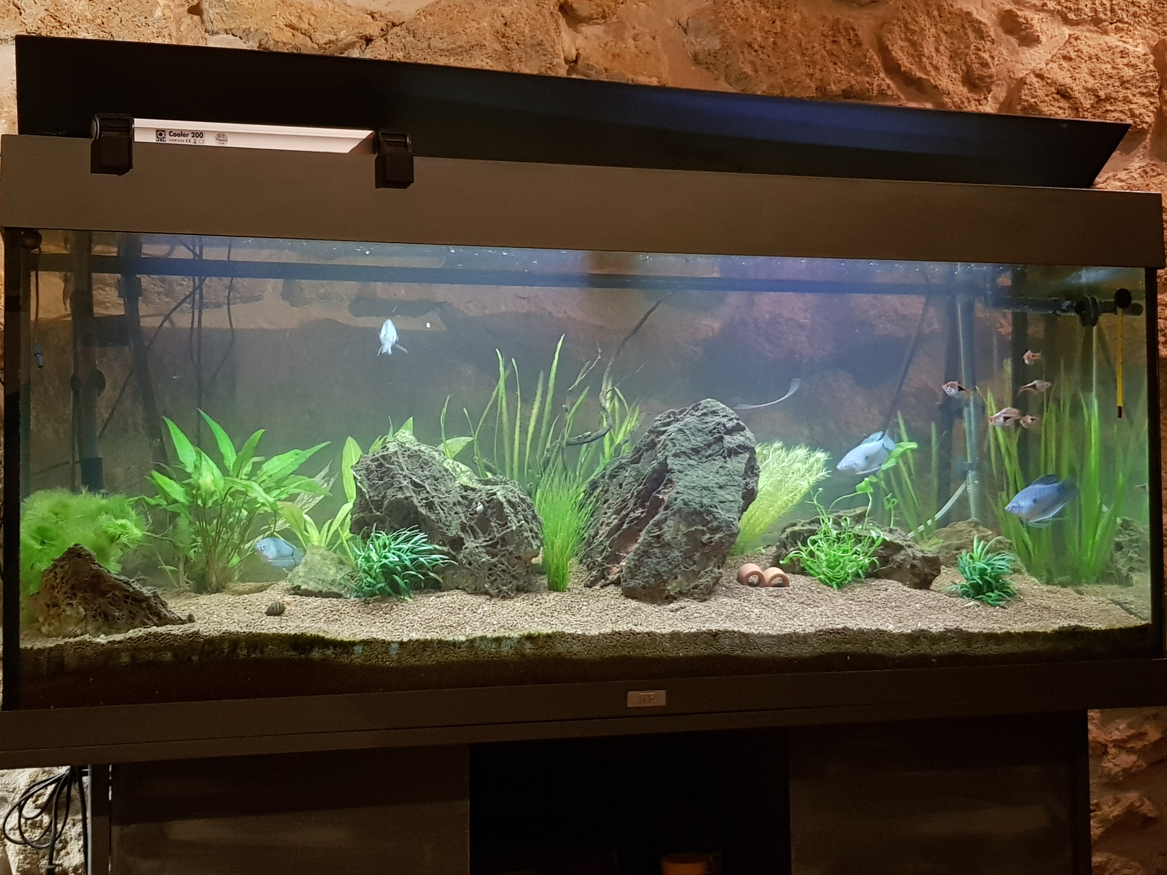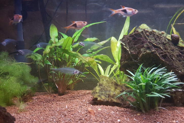 4 Gouramis Bleus (Trichogaster) + 3 Crevettes d'Amano (Japonica) + 8 Rasboras arlequin + 6 Silures de Verre + 3 Neritina natalensis (escargots rayés)