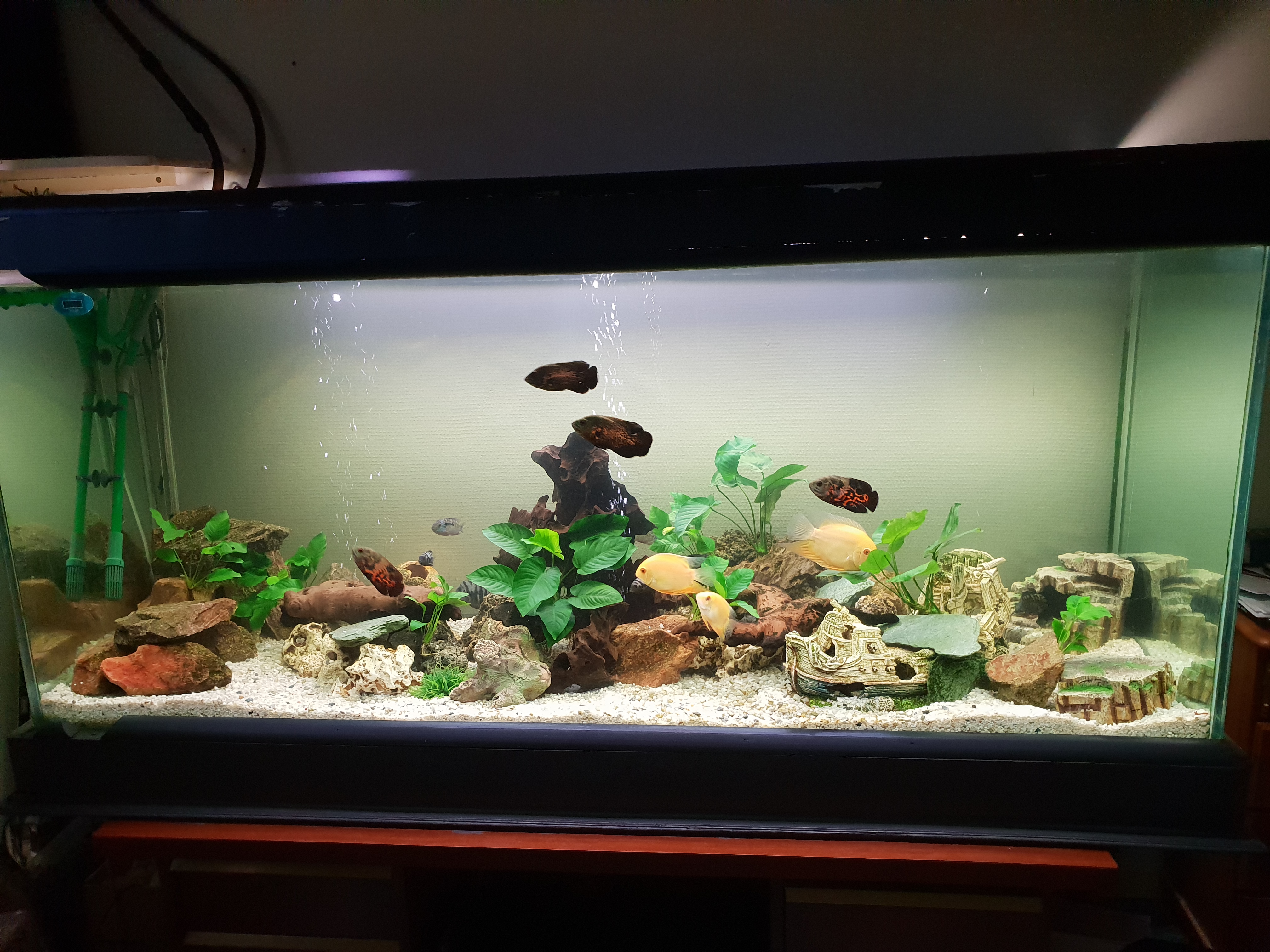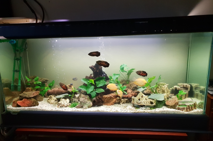 4 astronotus ocellatus, 6 cichlasoma nigrofasciatum, 4 Rocio octofasciata, 3 Heros severus gold et 1 pleco