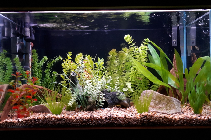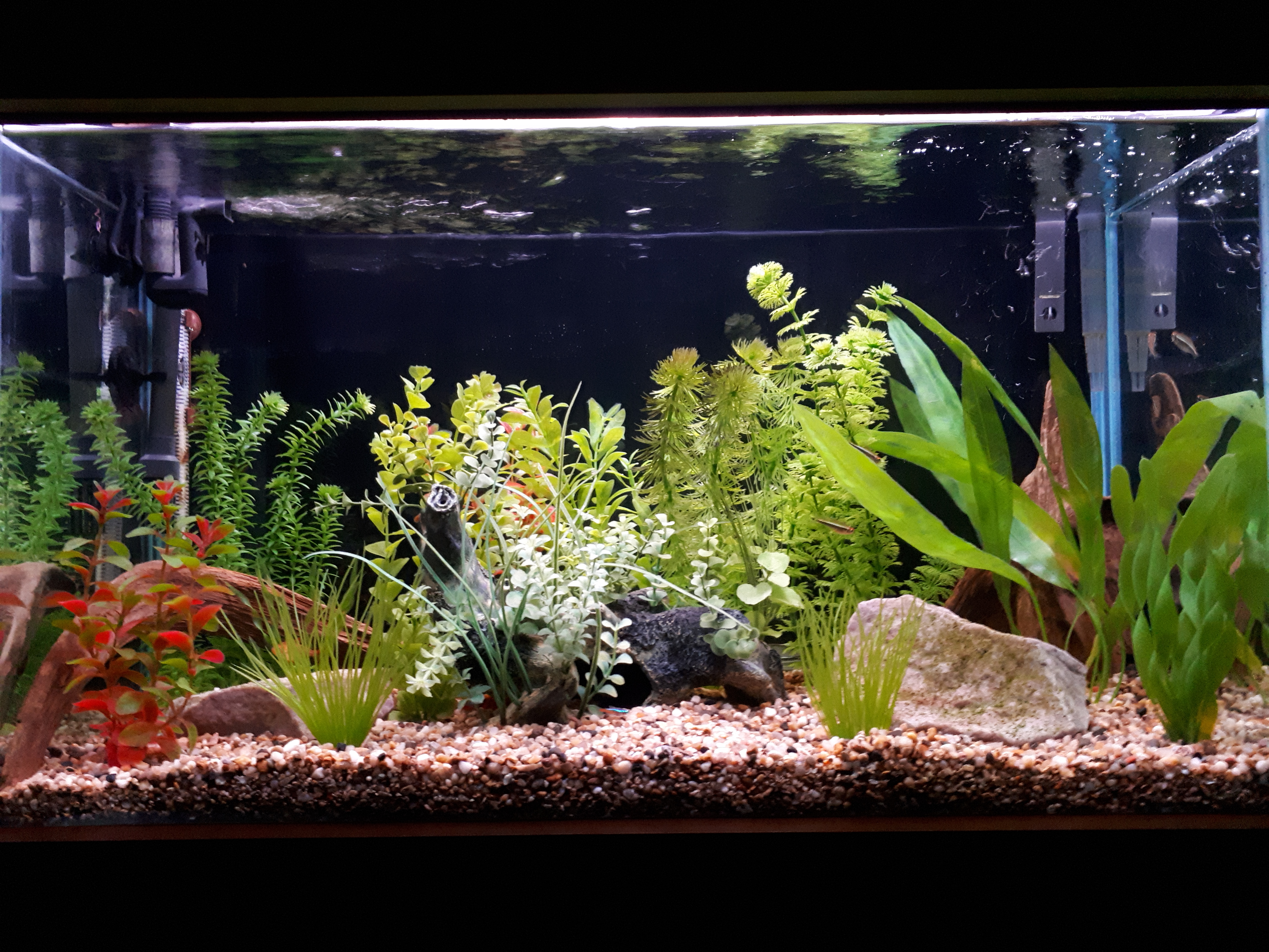 L'aquarium ne possède que des plantes articielles. Il y a également un ornement central (artificiel également). On retrouve aussi deux morceaux de vrai bois et 2 pierres.