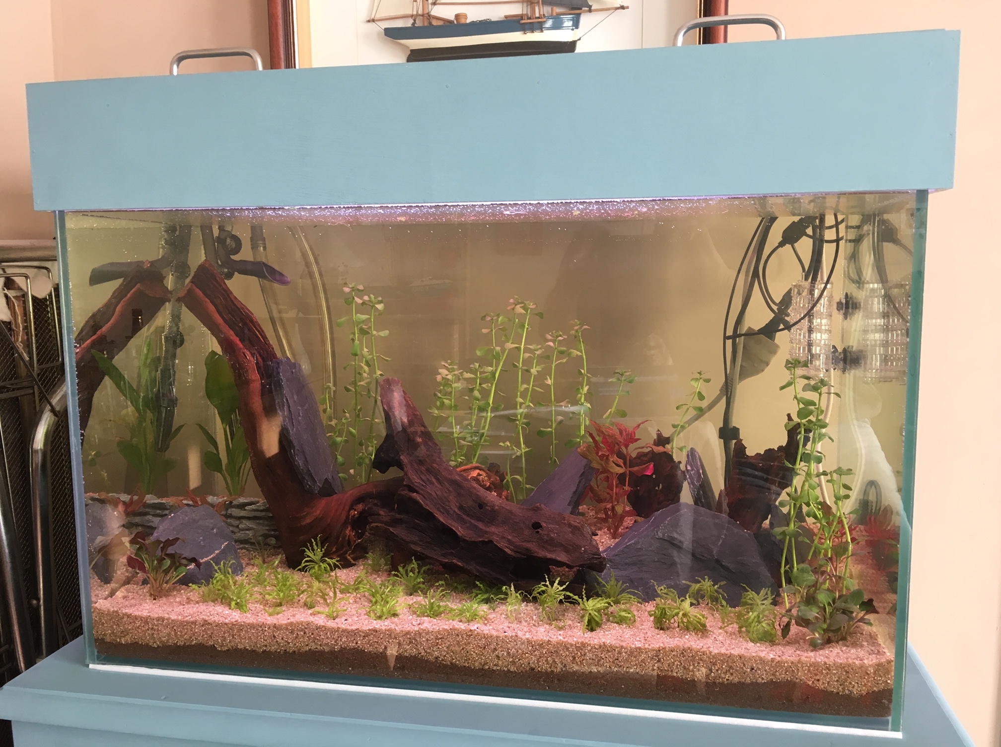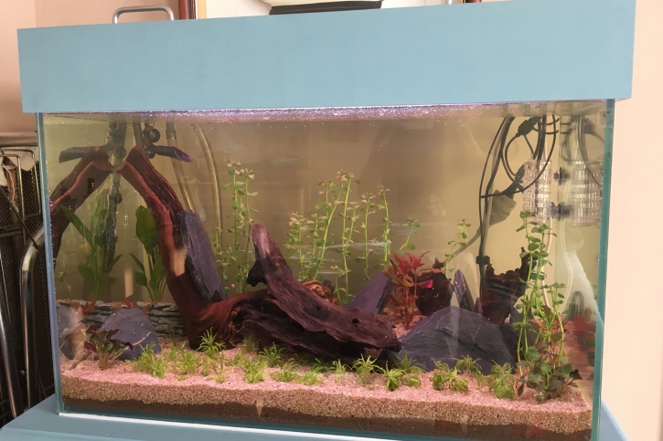 Cet aquarium a les équipements suivants : - Filtre extérieur SERA bioactive 130+UV - Eclairage led de 2 tubes SERA : 1 tube daylight sunrise et 1 tube plantcolor sunrise. Le tout branché à un variateur de lumière SERA LED digital Dimmer.