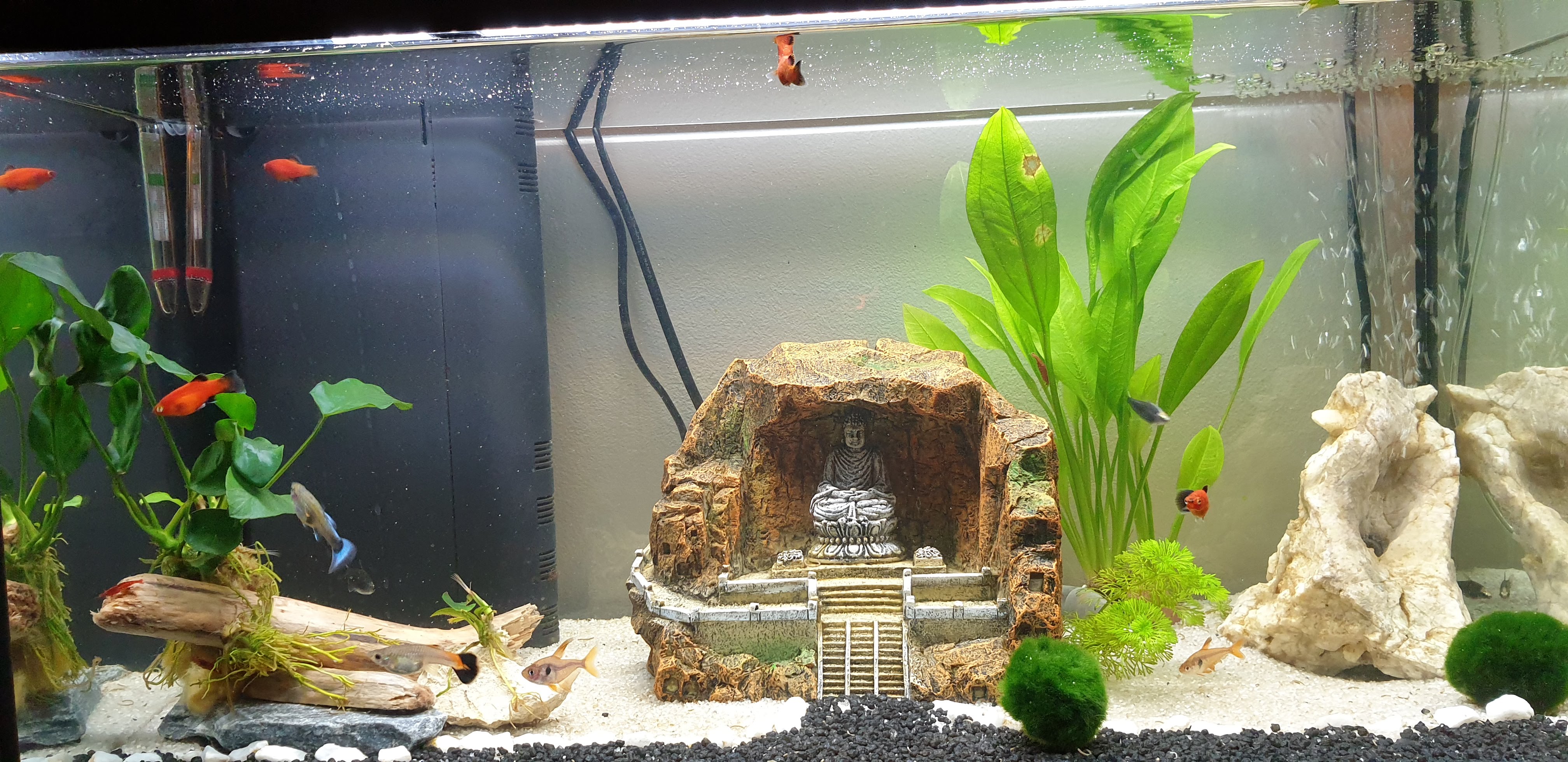 2 femelles guppy 4 platy rouges et noirs 1 antistrus 3 tétra fantôme 3 tétra empereur 5 crevettes