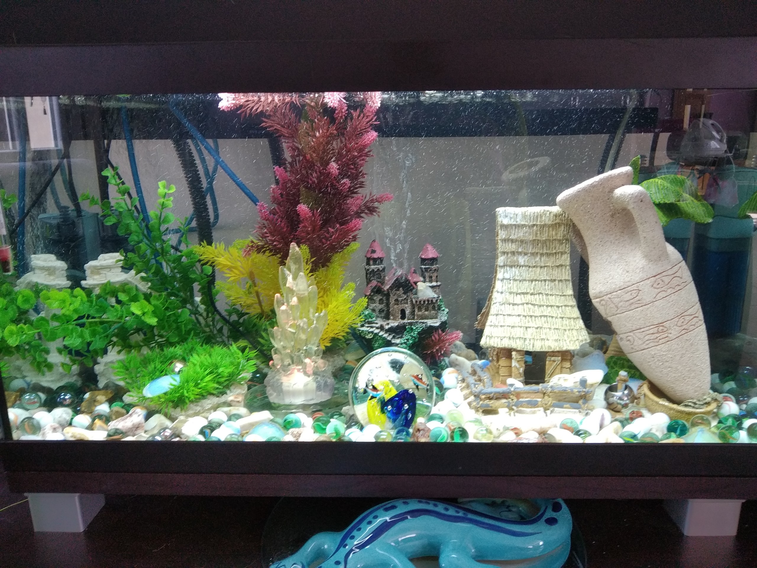 Décors avec plante en plastique, Cruche avec bulleur à l’intérieur , bulleur avec 3 buses de sorties d'air avec des tuyau transparent...