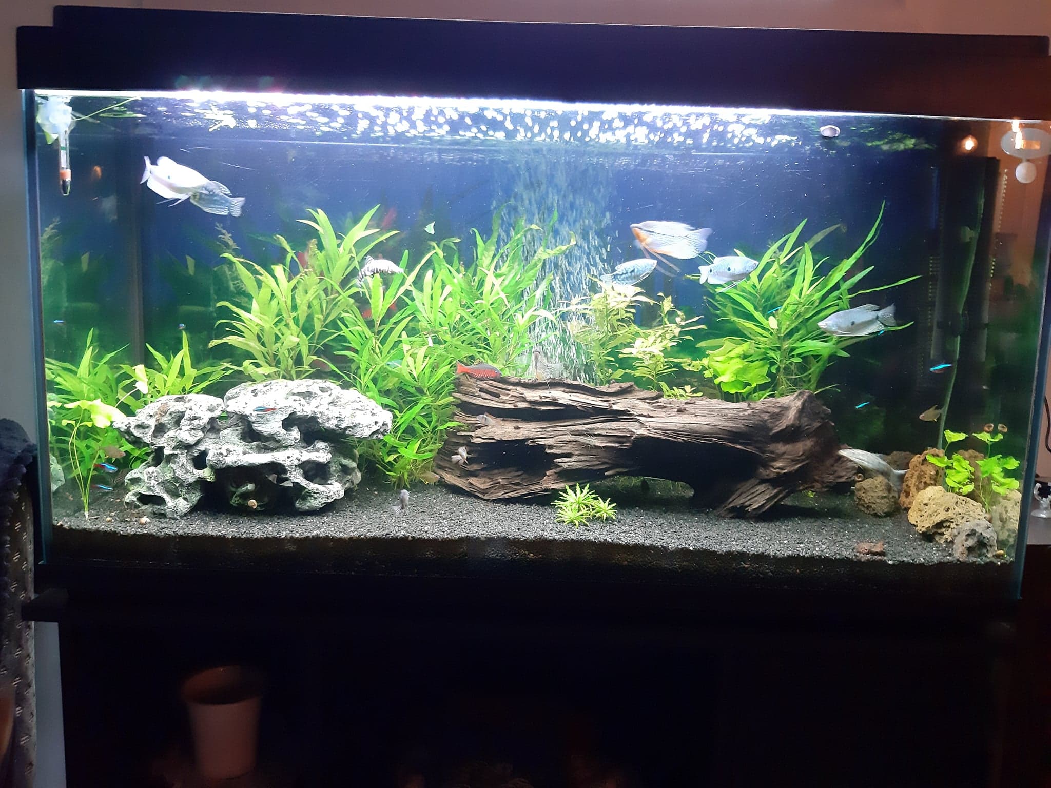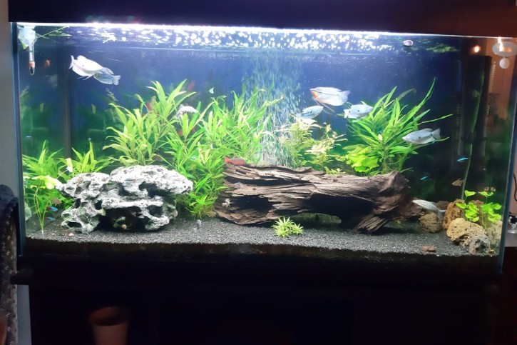 Une imitation roche creuse, une racine mangrove, 5 pierres (tailles 8.5cm environ) de roches volcaniques, planté sur le fond.