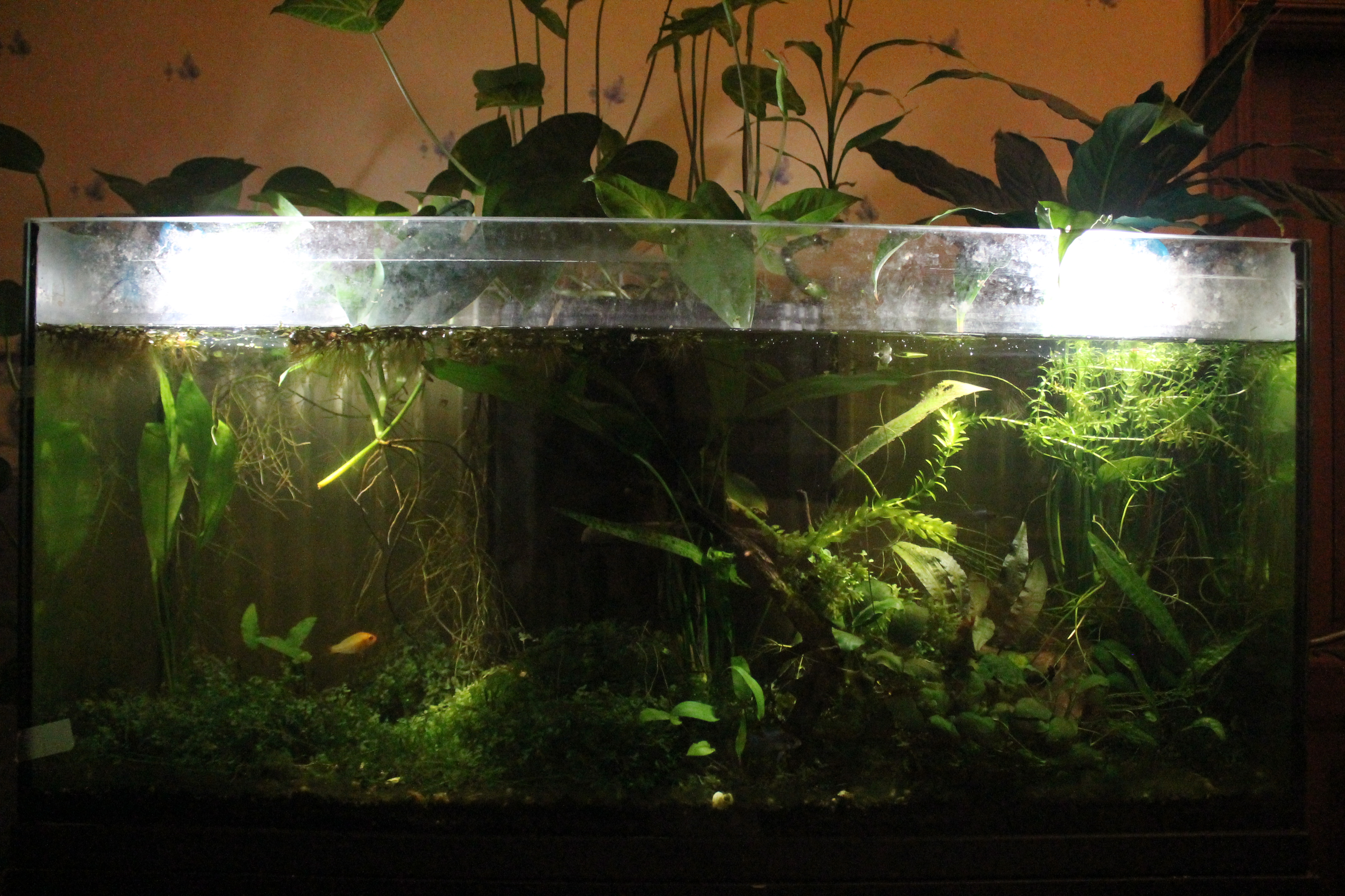 Low-tech : seulement un éclairage led. Ce bac est mon plus vieux. Il est très stable et la jungle de plantes en trempette a tellement raciné dans la décante qu'il m'est impossible de les en retirer sans les abimer. Il a pendant un temps été spécifique aux