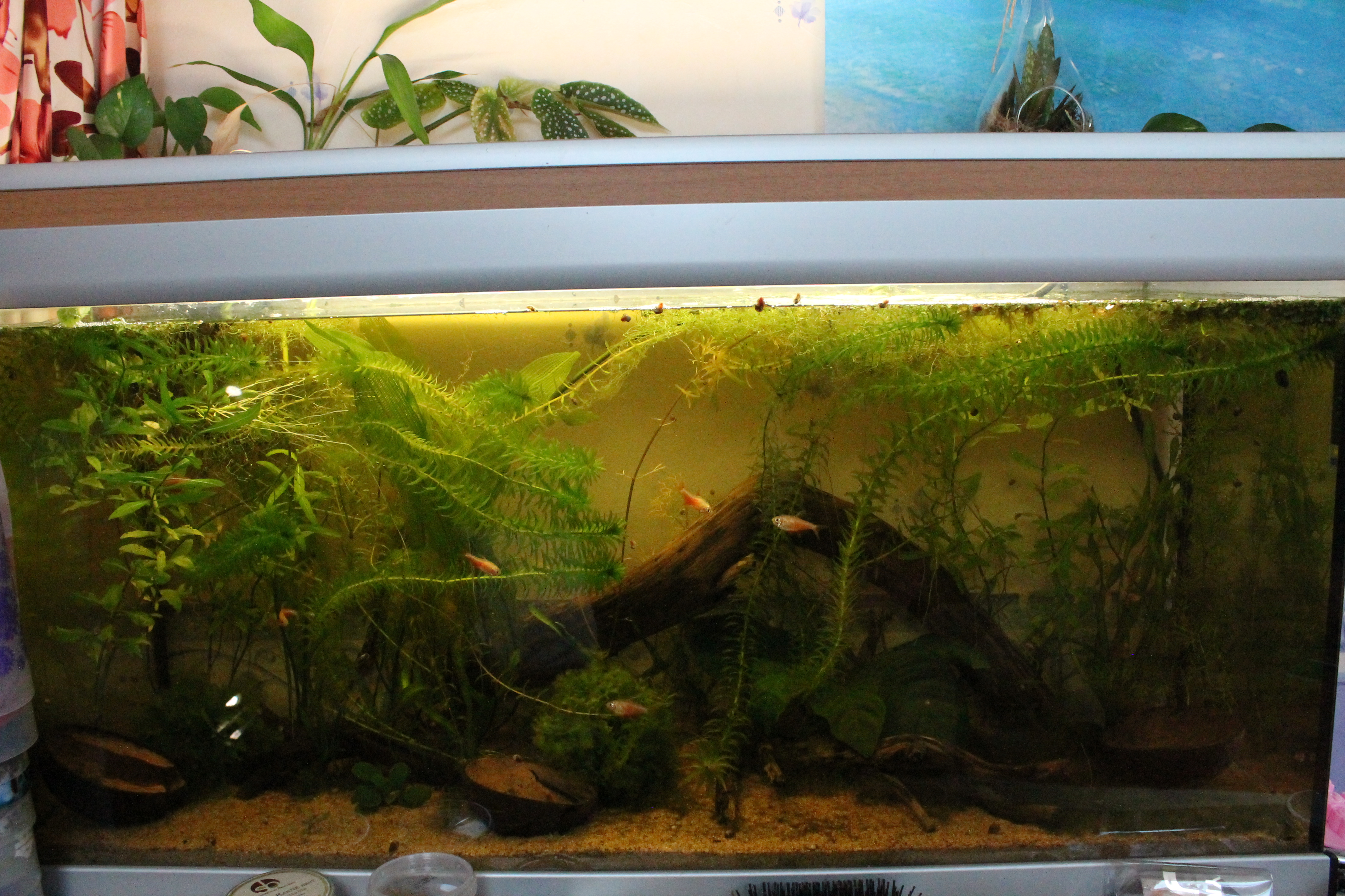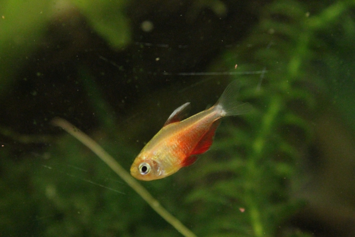 Trio de Macropodus opercularis : 2 patrons normaux et une femelle bleue dominée - Banc d'Hyphessobrycon flammeus oranges - Banc de Pangio kuhli