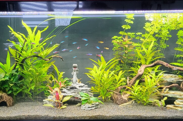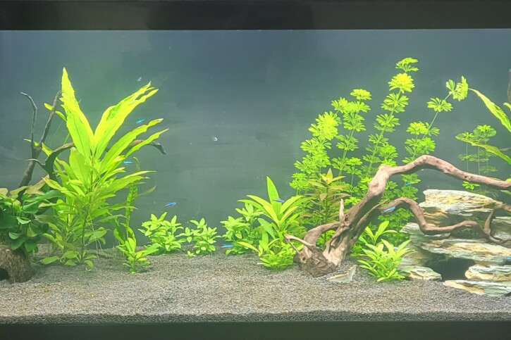 Un sol jbl manade, des racines avec décor rocheux, plantes: anubias, limnophilia sensiflora, hygrophila corymbosa et bacopa caroliniana