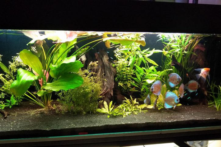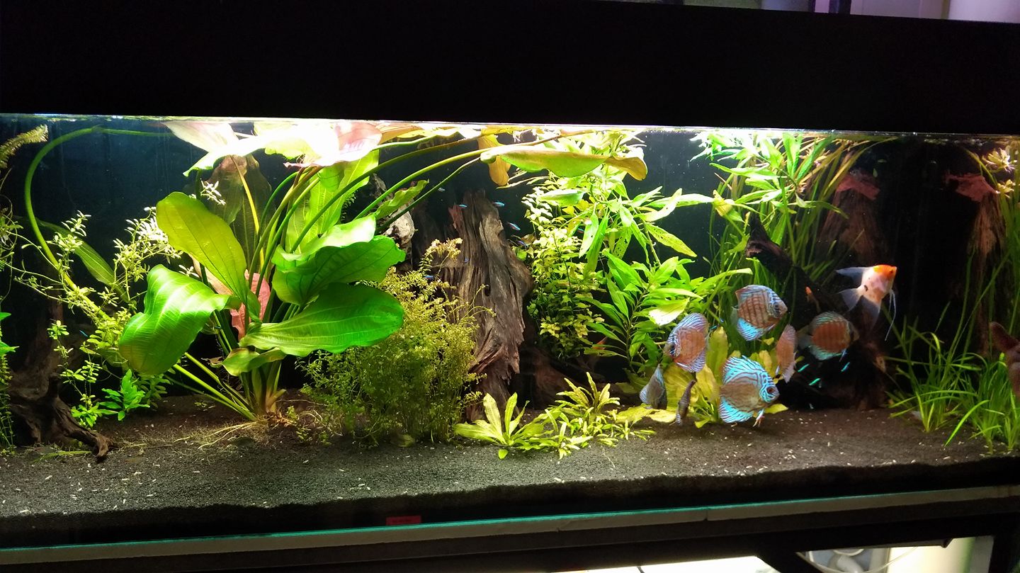 Discus Turquoise, Otocinclus affinis, Sturisoma aureum, Hemigrammus bleheri, Paracheirodon axelrodi, pristella maxillaris, Corydoras duplicareus, l144, Caridina multidentata.