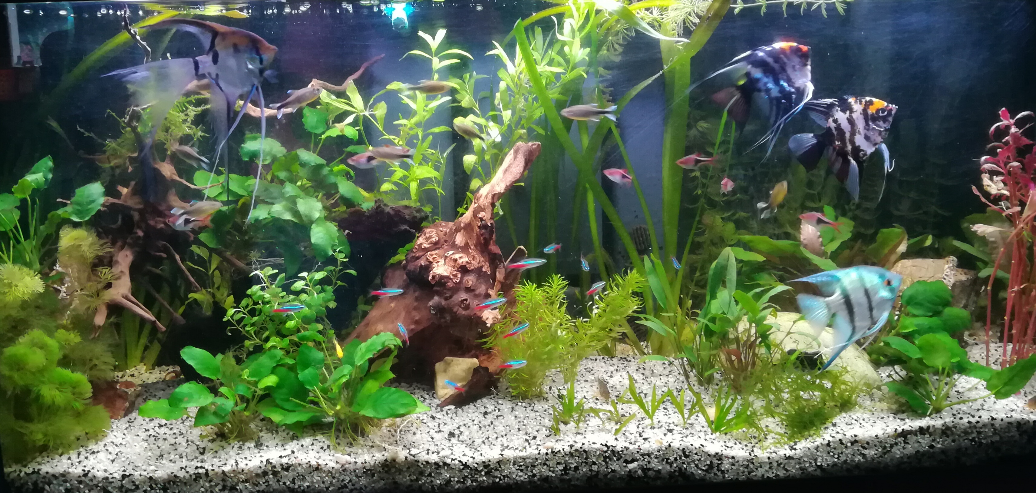 4 scalaires, 15 Paracheirodon innesi, 10 Tétra hasemania, 2 ancistrus, 2 Corydoras sterbai, 2 Corydoras albinos, 2 Corydoras paleatus, 2 Corydoras panda, 2 Corydoras shwartzi, 1 Neritina turrita
