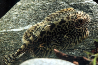 Le Gastromyzon punctulatus est un poisson brun foncé, ponctué de points jaunes clairs.