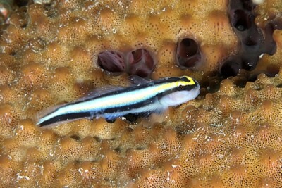 Les juvéniles sont jaune vif, avec deux lignes bleu vif qui partent du museau jusque sous le milieu de la nageoire dorsale où elles se regroupent au niveau d'une grande tache noire à liseré bleu. Un liseré bleu est également présent sur les nageoires dorsale et anale.