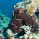 Octopus cyanea measures between 18 and 22 cm. This mollusc is bicolore with a predominantly marron and blanc body. The also has blanc tasks.