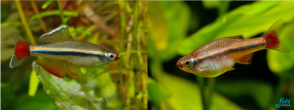 Toujours chez les tétras, les mâles de certaines espèces ont les nageoires colorés, comme c’est le cas pour l’Hyphessobrycon robustulus (ci-dessous).