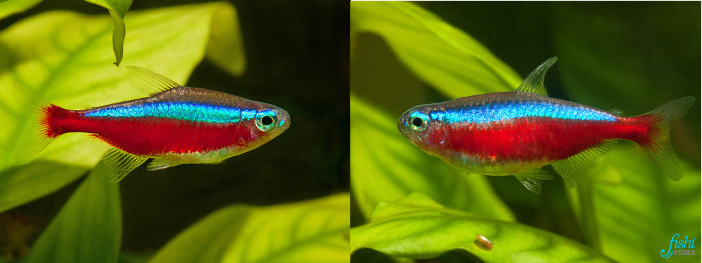 Chez les poissons du genre Nannostomus, les mâles sont là encore plus intensément colorés. Ils sont également plus élancés que les femelles.